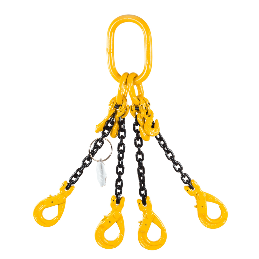 Hochwertige 4-strängige Anschlagkette ausgestattet mit Sicherheitshaken und Verkürzungshaken. Hergestellt aus hochwertigen Komponenten der Klasse 8. Anschlagketten gehören zu den beliebtesten Hilfsmitteln zum Heben von Lasten in verschiedenen Branchen. Sie eignen sich hervorragend als Hilfsmittel zum Transportieren und Heben von Lasten. Alle unsere Hebegurte erfüllen die Anforderungen der EU-Normen und verfügen über CE-Kennzeichnungen. Die Hauptvorteile unserer Anschlagmittel sind eine hohe Beständigkeit gegen mechanische Beschädigung und Temperatur, sie sind 100 % sicher und bieten eine hohe zulässige Arbeitslast bei geringem Eigengewicht.