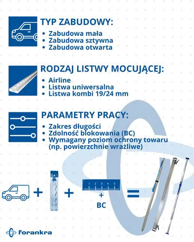 Należy uwzględnić szerokość przestrzeni ładunkowej, typ pojazdu oraz rodzaj przewożonego ładunku. Ważne jest również dopasowanie końcówek do systemu mocowania (np. Airline).